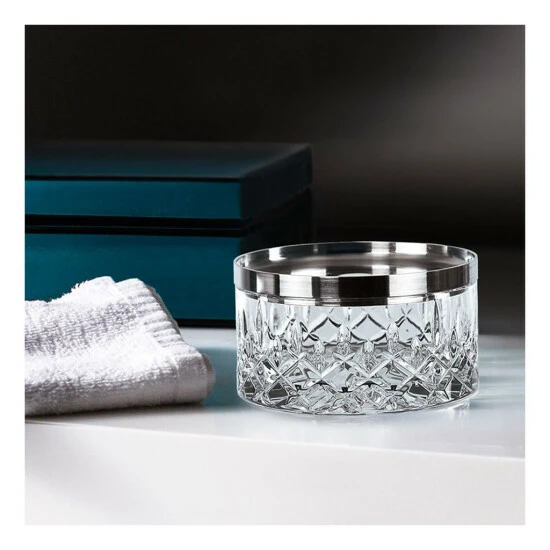 In der Aufbewahrungsdose Nachtmann SPA Noblesse können kleine Habseligkeiten Ihrer Gäste, Pads oder Hygieneartikel ansprechend verwahrt werden. Die Dose wird durch einen Edelstahldeckel abgeschlossen. Auch außerhalb des SPA-Bereiches sorgt die brillante Kristallglasdose für ein s Ambiente.