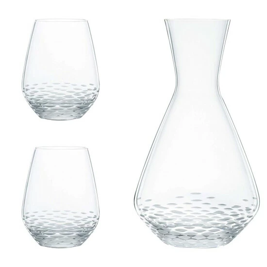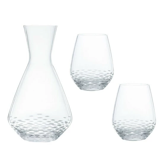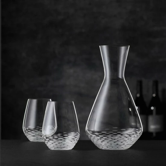 Das Dekantierset MOSAIK lädt zu romantischen Augenblicken zu zweit oder auch ganz einfach zu unkompliziertem Weingenuss im gemütlichen Rahmen ein. Die Weingläser mit passendem Dekanter überzeugen mit einem besonders ansprechenden Design, das aufwändig per Hand eingeschliffen wurde. Die bauchige Karaffe kann sowohl für Weißwein als auch für Rotwein verwendet werden und ermöglicht dank lasergeschnittenem Rand ein tropffreies Ausgießen. Das Dekantierset aus Kristallglas passt durch die ihm eigene Symbiose aus puristischem Design und handgearbeitetem Nachbildung zu jedem Einrichtungsstil und ist darüber hinaus auch ein gern gesehenes, edles Geschenk.