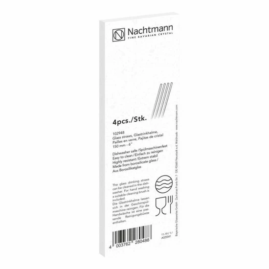 4-teiliges Glastrinkhalm-Set für den Genuss von Cocktails, Mixgetränken und Softdrinks. Umweltfreundlich: Frei von Plastik und wiederverwendbar, problemlose Reinigung bei hohen Temperaturen für absolute Hygiene. Ideal für ein sommerliches Feeling oder als Trinkhilfe. Vielseitig einsetzbare Trinkhalme für eine besonders langlebige Verwendung. Lieferumfang: 4 Nachtmann Glastrinkhalme 15 cm mit Reinigungsbürste.