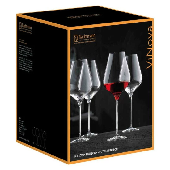Balení obsahuje 4 sklenice na červené víno o objemu 840 ml ze série ViNova Nachtmann. Působivá, moderní a vysoce funkční kolekce křišťálového skla. Úžasný design ViNOVA, který nabízí potěšení z vína v celé své kráse, zvyšuje a vylepšuje úroveň stolování. Sklenice pro každého, kdo chce do svého baru přivést nový lesk.